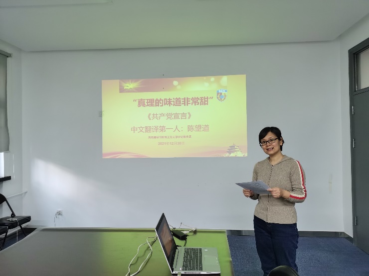 《共产党宣言》中文翻译陈望道先生:“真理的味道非常甜”——学院教工党支部开展支部书记讲党课活动2021年12月30日上午,冰球官网教工党支部开展党支部书记讲党课活动。教工支部书记林薇老师以《“真理的味道非常甜”》为题,讲述了《共产党宣言》中文翻译第一人陈望道先生生平和翻译《共产党宣言》的故事,分享了自己学习陈望道先生一生翻译和学术研究经历的感悟和体会。党总支书记葛冬冬主持党课。林薇老师从陈望道翻译《共产党...