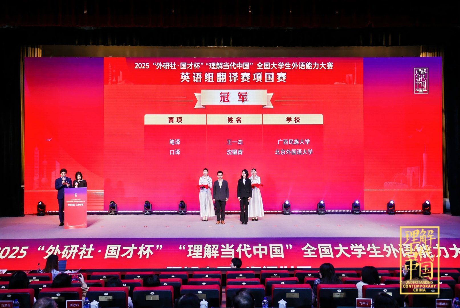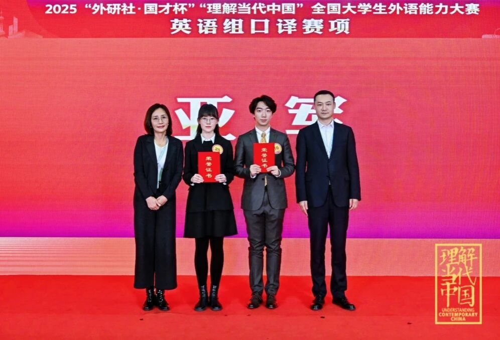 2025年12月5-8日,“外研社·国才杯” “理解当代中国”全国大学生外语能力大赛圆满落幕。在“英语组口译赛项”中,MG冰球突破官网学子再创佳绩。2023级英语口译(复语)硕士研究生沈韫青获得国赛金奖(冠军),指导老师:曾佳宁、张雨晴;2024级英语口译(复语)硕士研究生李如蓝获得国赛金奖(亚军),指导老师:张璐、曾佳宁;2025级英语口译硕士研究生闫思晗获得国赛金奖,指导老师:张雨晴、张璐;2025级英语口译硕士研究生马雨萌获得国赛银奖,指导老师:邓小玲。