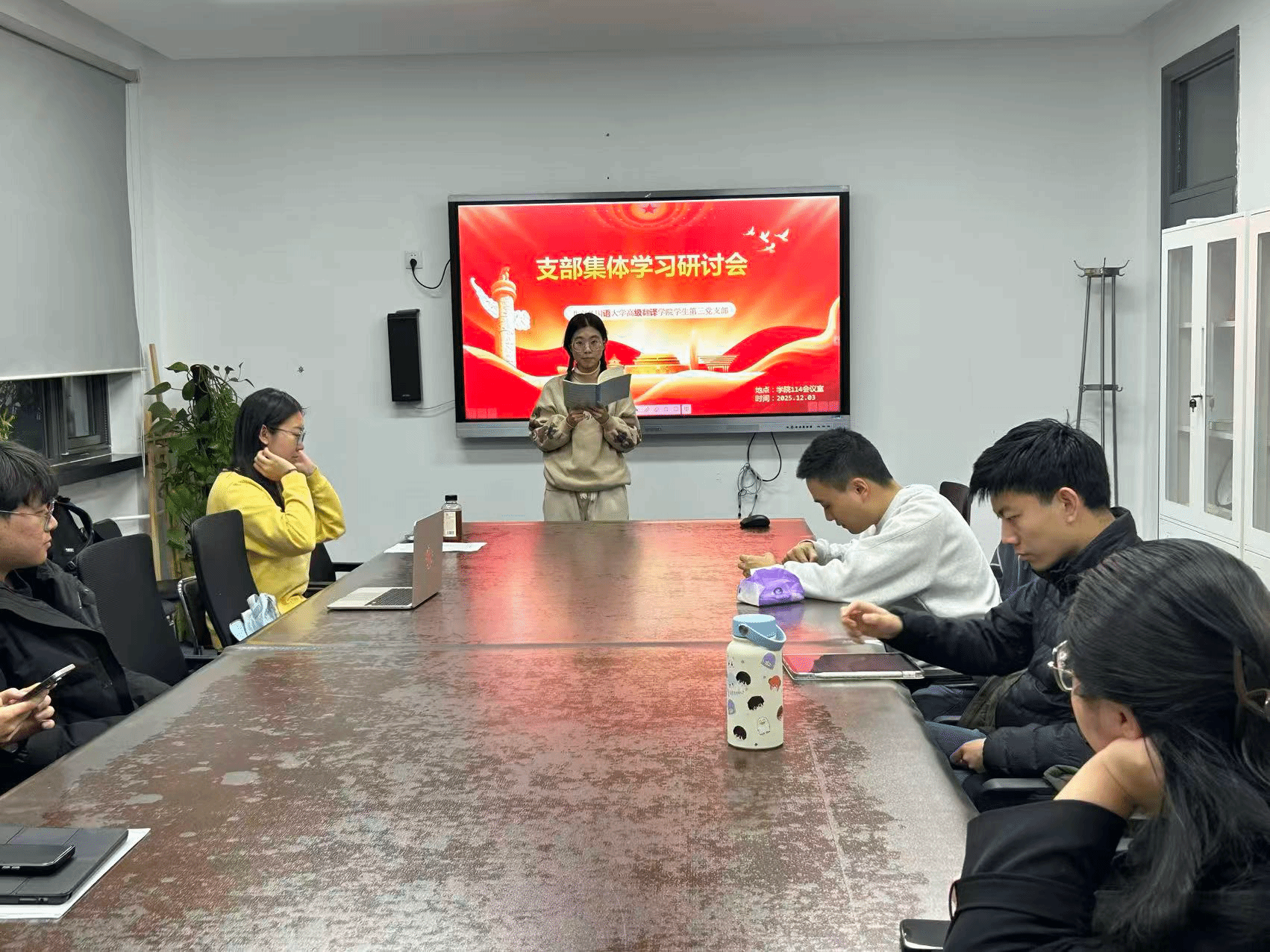 12月11日,学生第一党支部在224教室召开“初心如磐担使命,盛世共赴谱华章”专题研讨会,支部书记王茂兴带领重温主题党课内容、深入学习习近平总书记关于中国梦的重要论述。党员与入党积极分子围绕党的历史地位、中国式现代化展开热议,结合翻译技术、跨文化传播等专业方向,探讨如何以精准译介讲好中国故事,将专业所长转化为助力民族复兴的实践力量。