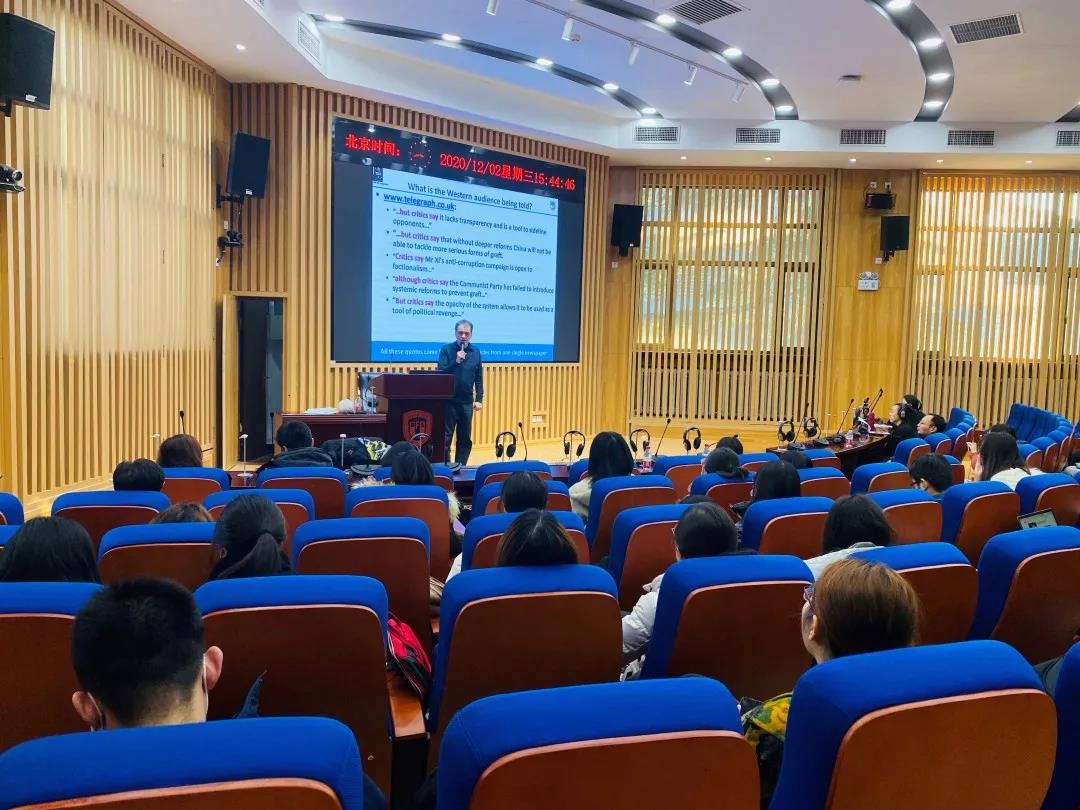 2020年12月2日下午3点,应我校翻译硕士(MTI)教育工作专家委员会和MG冰球突破官网的邀请,中国外文局高级编审大卫•弗格森(David Ferguson)先生在高翻学院同传会议厅(原300人教室)为了同学们带来了一场题为“人工智能与翻译的未来”的演讲,讲座由MG冰球突破官网李长栓教授主持,多个院系的学生近百人聆听了讲座。