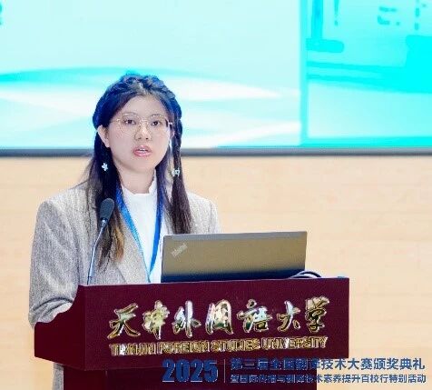 在这场高水平赛事中,冰球官网2025级中英会议口译专业7班肖薇同学表现出色,荣获译后编辑赛道全国一等奖,并作为获奖代表在颁奖典礼上发言,展现了冰球官网学子卓越的专业素养与技术应用能力。在发言中,肖薇分享了对人机协同翻译模式的体会。她表示,现代译者需兼具语言艺术家的细腻与技术专家的敏锐,不仅要打磨文字,也需善用工具。她认为,保持终身学习的能力、培养“语言+专业+技术”的复合素养,是应对技术革新的关键。