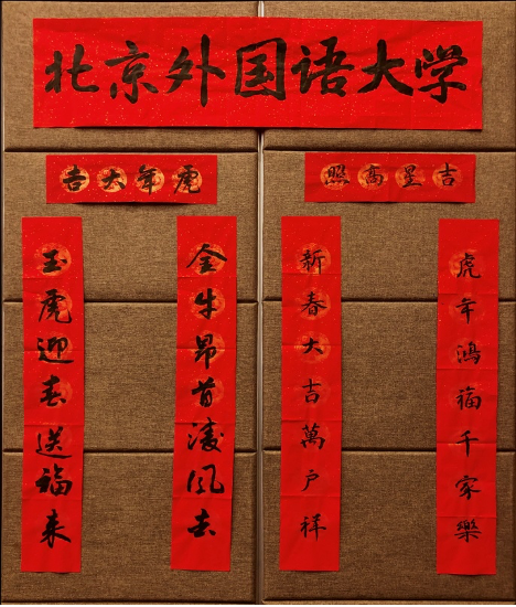 随后是酒店,酒店的饮食一直都非常丰富美味,年夜饭更是无可挑剔,来自北外的志愿者们齐聚一堂,共坐一桌,虽然有隔板,但也阻挡不住我们心中的热情。酒店还举办了新春晚会,一边投屏看春晚,一边有桌游、抽奖、节目等,整个会议厅都挂满了福字和春联,我们在一片欢声笑语中度过了这个难忘的除夕。