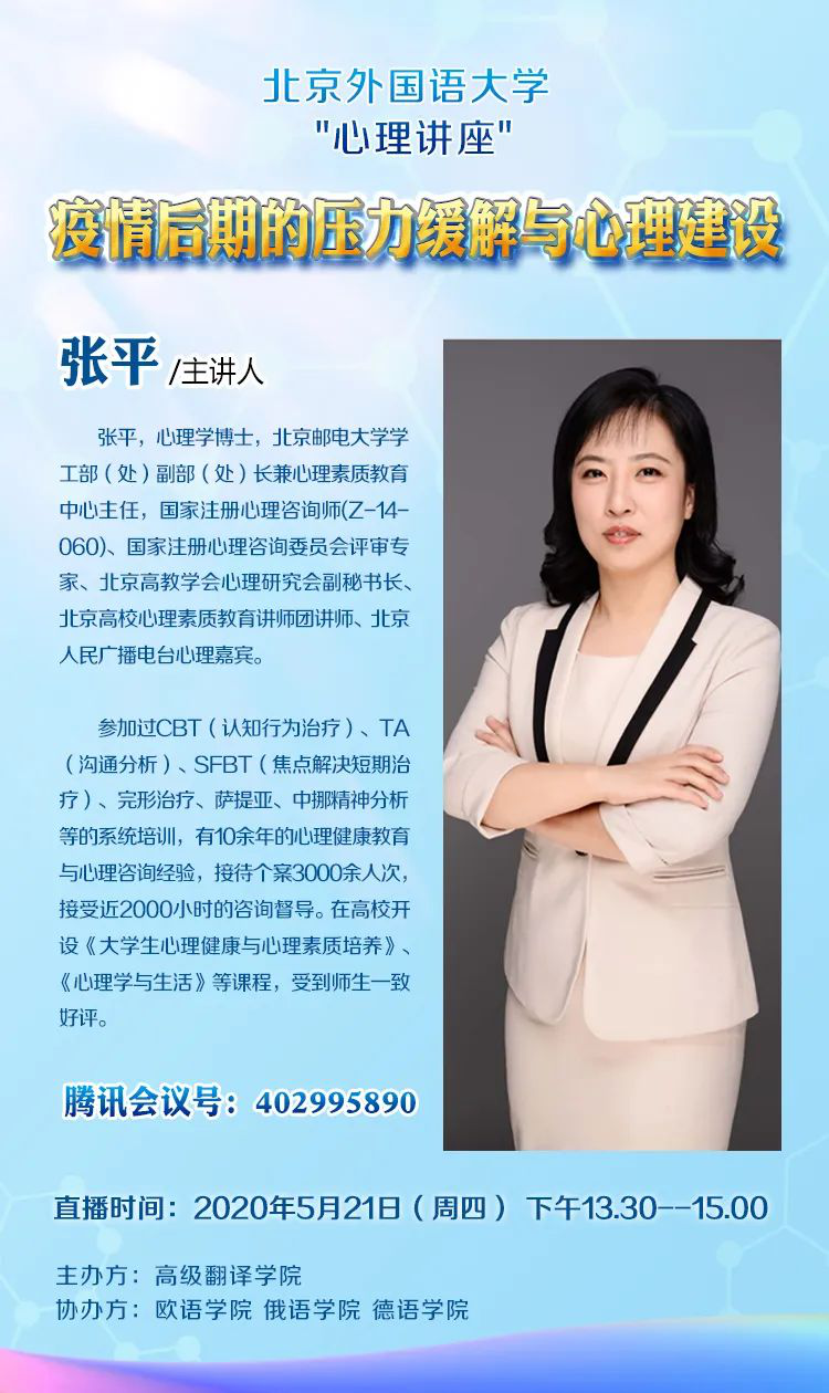 2020年5月21日下午13:30,北外MG冰球突破官网举办了主题为“疫情后期的压力缓解与心理建设”线上讲座。