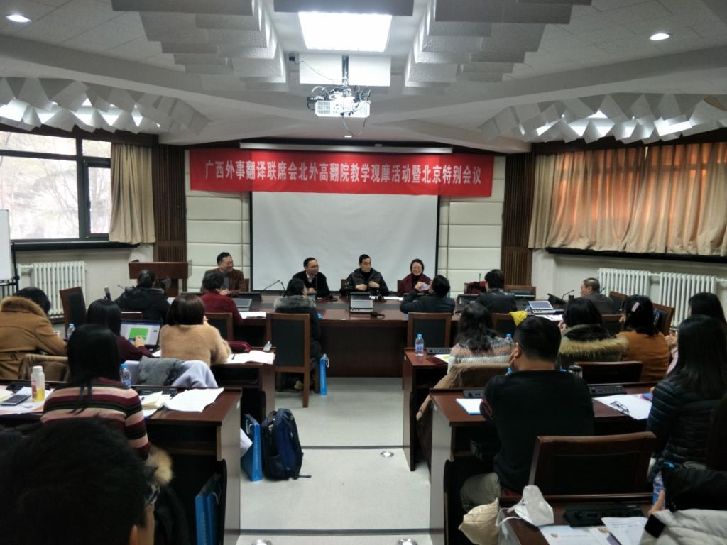2017年11月21日至23日,广西自治区外事翻译联席会组团前来MG冰球突破官网观摩翻译教学,并由MG冰球突破官网主办了联席会的北京特别会议。