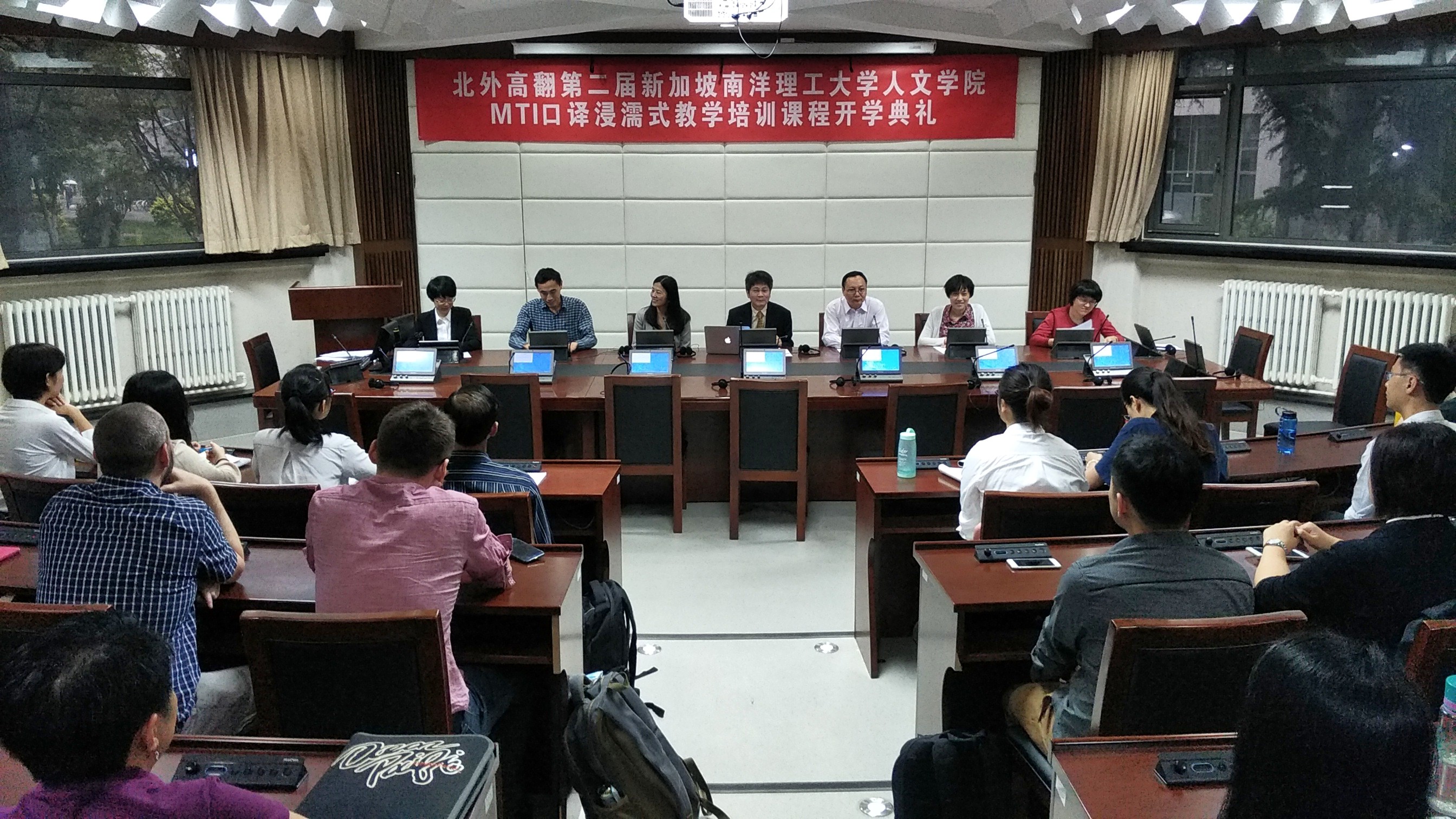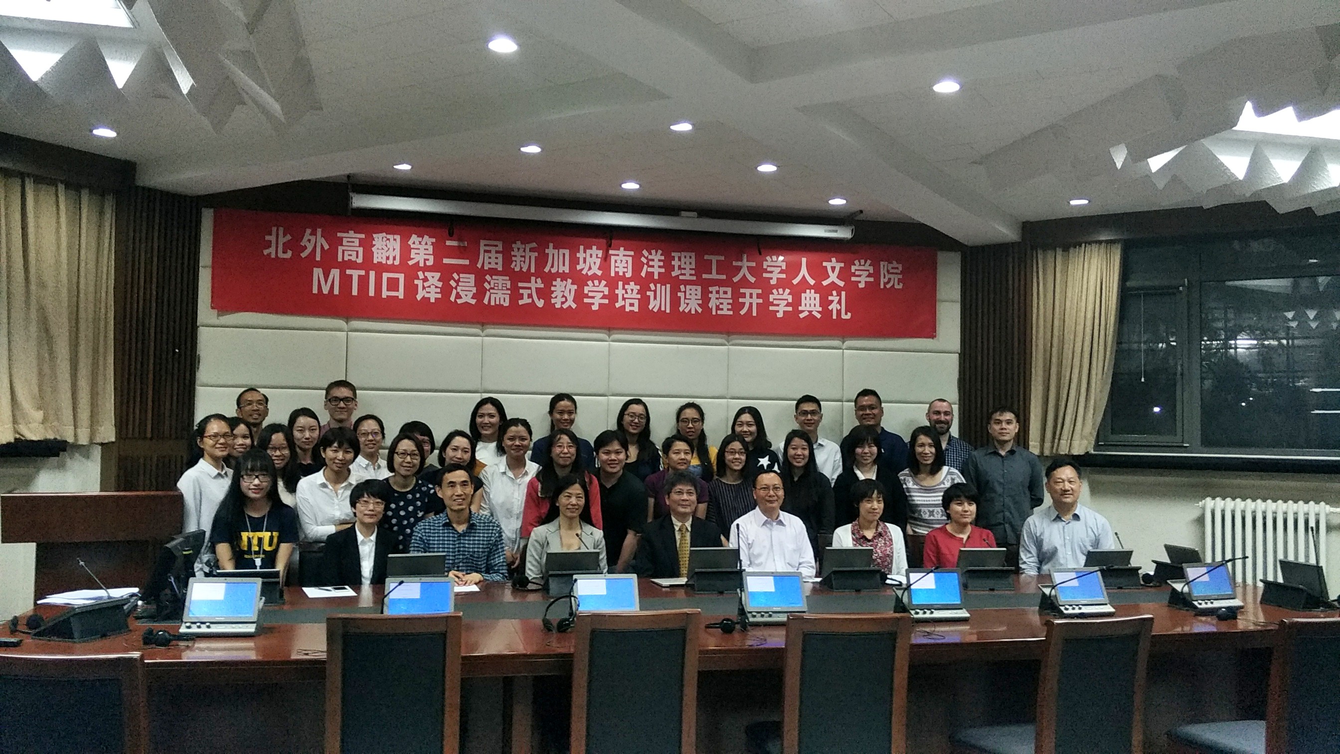 2017年5月22日,北外高翻第二届新加坡南洋理工大学人文学院MTI口译浸濡式教学培训课程正式开课。开课前,举办了隆重的开学典礼,新加坡南洋理工大学人文学院院长陆镜光、高虹博士和卞蕾老师;MG冰球突破官网胡晓莉书记、李长栓和姚斌副院长参加了开学典礼。