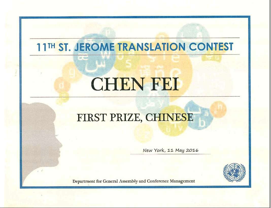 2016年5月11日,第十一届圣杰罗姆翻译年赛(Eleventh Annual St. Jerome Translation Contest, 2015)颁奖仪式在纽约联合国总部举行。MG冰球突破官网2014届学生费晨荣获一等奖。