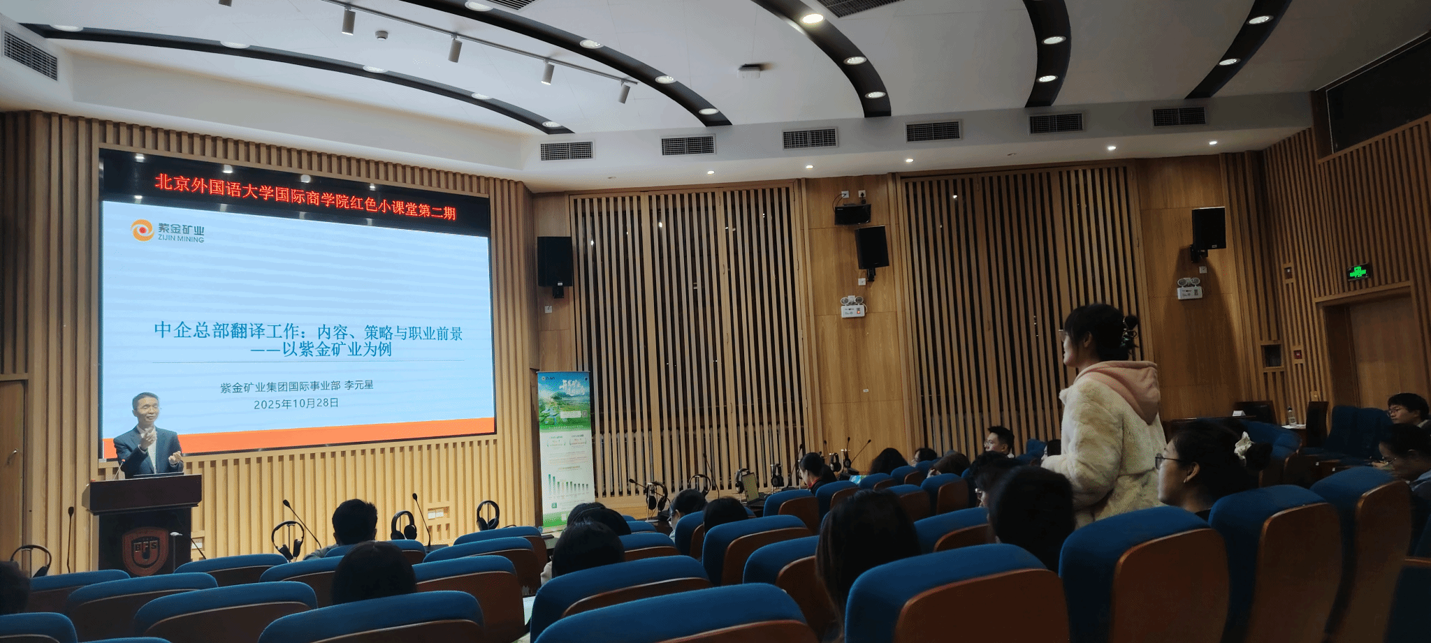 在互动交流环节,同学们围绕翻译学习方法、企业培训机制、技术工具支持、翻译质量管控等方面积极提问,紫金矿业代表一一予以细致解答,现场气氛热烈。