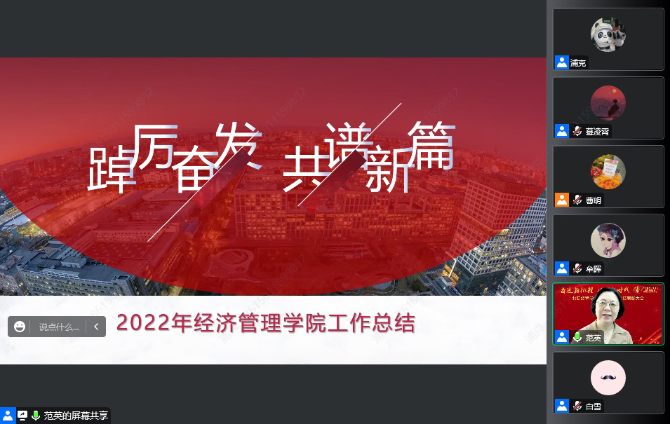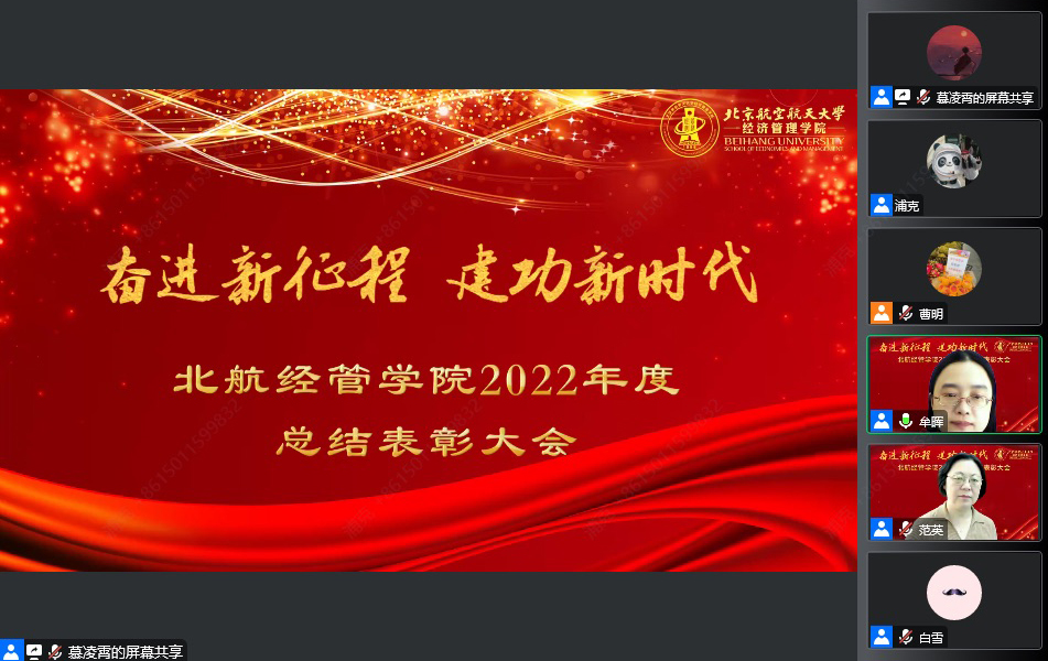 范英院长首先代表学院做2022年度经管学院工作报告。范院长回顾了不平凡的2022年,这一年,党的二十大胜利召开,北航隆重纪念建校七十周年,经管学院落实立德树人根本任务,全力投入各项工作,取得了显著成绩。围绕党建工作、师资队伍、学科建设、人才培养、科学研究、管理服务与文化建设等方面,范院长总结并肯定了学院过去一年的工作。她对全体教职工辛勤工作、努力耕耘给以充分肯定,感谢大家为学院发展贡献教育科研力量。