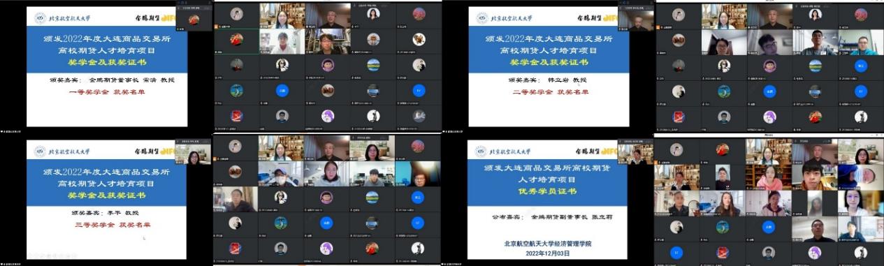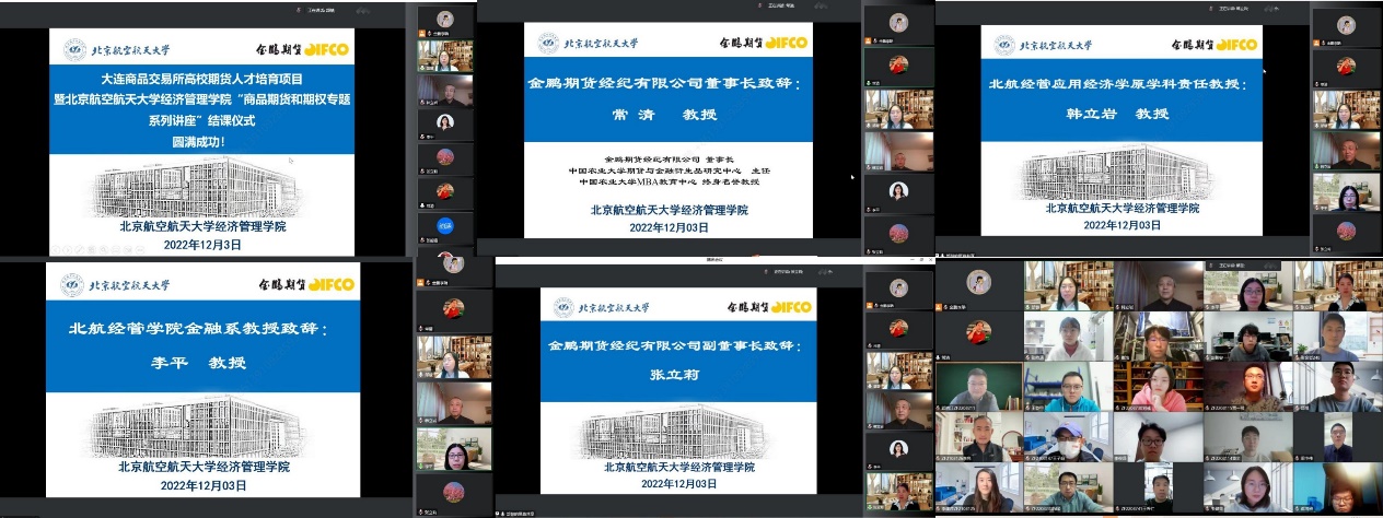 2022年12月3日下午,北航365英国上市公司官网2022年“商品期货与期权专题系列讲座”在线举办了结课仪式并颁发奖学金,本年度专题系列讲座宣告圆满结束。该专题讲座由北航经管学院金融系与金鹏期货经纪有限公司联合组织,受到大连商品交易所高校期货人才培育项目的支持,依托北航MBA中心进行招生和管理,并得到研究生教务的大力支持。结课仪式由365英国上市公司官网金融系部慧副教授主持,金鹏期货经纪有限公司董事长常清教授、金融系李平教授、应用经济学原责任教授韩立岩教授、金鹏期货经纪有限公司副董事长张立莉女士均参加结课仪式并致辞。
