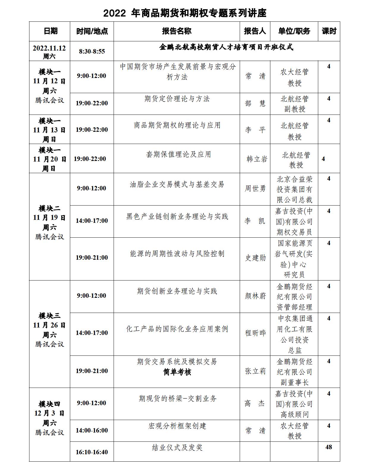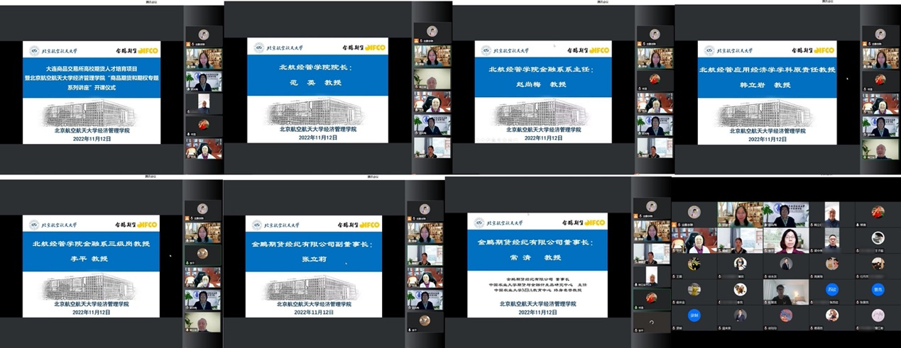 2022年11月12日上午,北航经管学院2022年“商品期货与期权专题系列讲座”正式启动,并在线上举办开班仪式。“商品期货与期权专题系列讲座”是北航经管学院金融系打造的实践前沿讲座系列之一。该专题系列讲座由北航经管学院金融系与金鹏期货经纪有限公司联合组织,受到大连商品交易所高校人才培育项目的支持,依托北航MBA中心进行招生和管理。