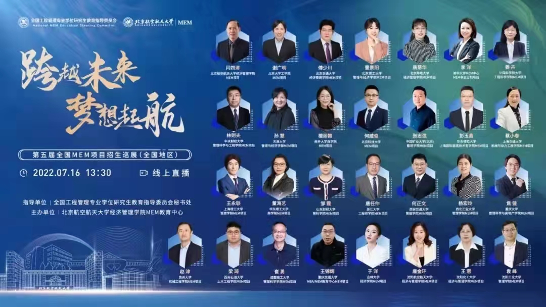 跨越未来,梦想起航。7月16日下午,第五届全国MEM项目招生巡展圆满举行。本次巡展采用线上线下相结合的形式,由全国工程管理专业学位研究生教育指导委员会秘书处指导、365英国上市公司官网主办,中国MEM教育网提供技术支持。