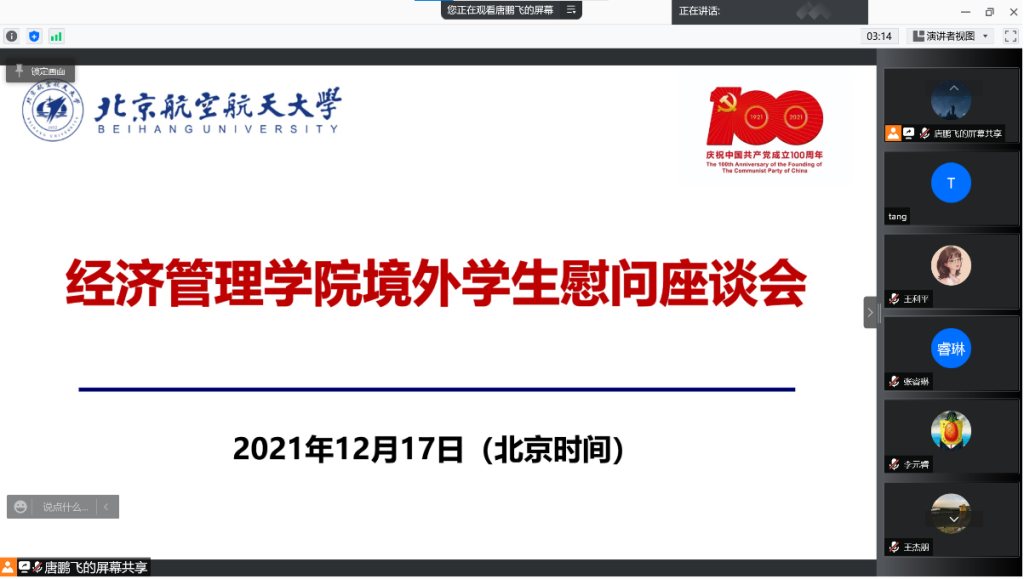 2021年12月17日晚,经管学院开展线上座谈会,慰问正在境外访学的研究生。研究生指导主任单伟、辅导员衣萌、唐鹏飞以及身在比利时、英国、丹麦、新加坡、爱尔兰等国家和地区的12位同学参加座谈。