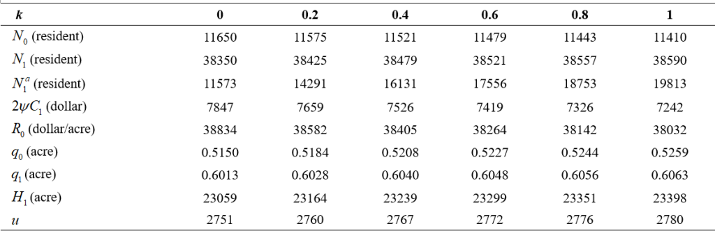 研究成果“The effects of transportation system improvements on urban performances with heterogeneous residents”考虑城市居民小汽车拥有权的异质性,揭示了居民居住分布、住房价格和均衡通勤成本之间的内生关系。研究结果显示道路的改善会使得两类出行者都受益,但公共交通的改善有可能损害小汽车拥有者的效用。研究成果“Effect of autonomous vehicles ontravel and urban characteristics”引入即时需求响应和按时间表运行的两类自动驾驶汽车,研究其对交通出行选择、住房选择和消费选择的影响,进而探索了自动驾驶对“中心区-郊区”城市系统(如图1所示)空间结构变迁的作用。结果发现随着自动驾驶技术水平的提高,郊区人口和即时响应型自动驾驶汽车的使用人数增加,城市核心区域的土地租金降低,郊区扩大,所有居民的效用增加(如表1所示)。这些发现有助于理解自动驾驶汽车、交通出行和城市系统之间的相互作用,并为自动驾驶时代的城市及交通规划提供参考。研究成果“Optimizing the number of employment subcenters to decentralize a congested city”探索了从建设就业次中心的角度来缓解CBD地区的拥堵。考虑交通出行、居民居住选址和土地利用的交互作用,建立简化的中心区-郊区的城市系统一般均衡模型,研究不同的财政政策下就业次中心的最优规划数量以实现系统最优。