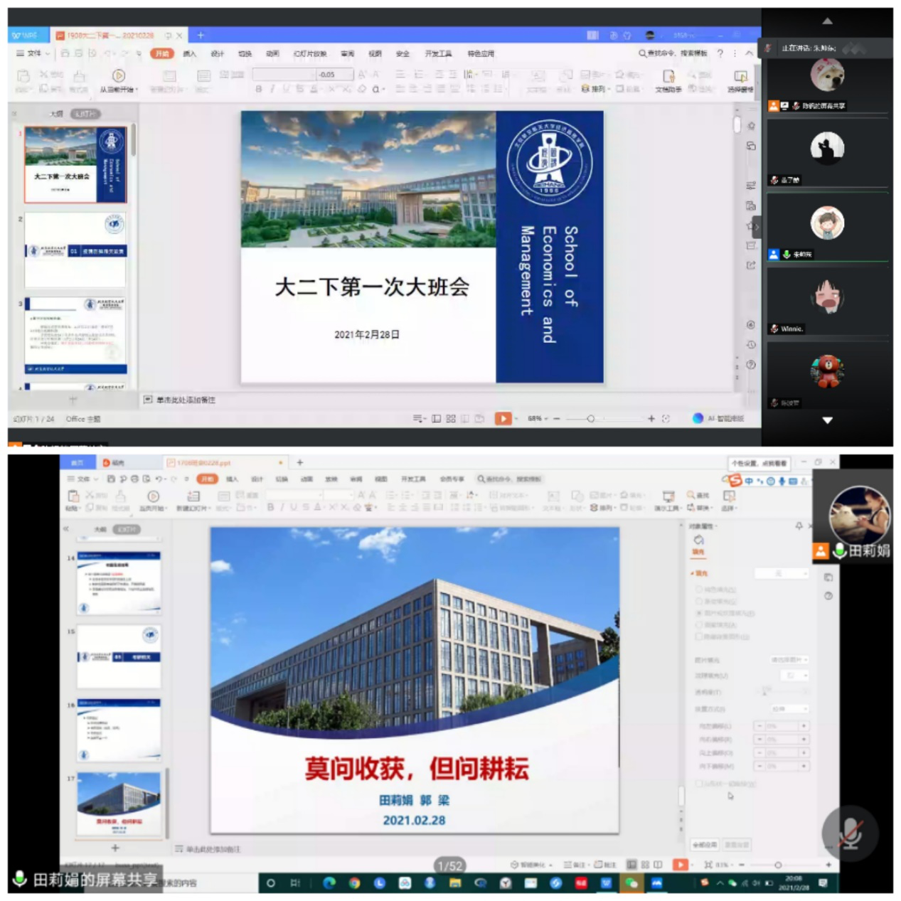 同时,各年级针对不同年级学生特点,差异化开展开学首日教育。1708大班即将毕业,针对学生较为关注的考研复试、毕业设计(论文)开题等工作,两位辅导员进行了答疑解惑。1808大班的主题为“抉择未来的路”,针对大三学年的第二学期,辅导员鼓励学生确定好未来方向,在国内升学、国(境)外深造、择业就业等方面,多方面收集信息,早做准备。1908大班辅导员则为同学们介绍了课程学习、专业方向分流等内容。高水平运动员大班的辅导员为大家分享了在疫情防控下抓好学业和训练的经验。