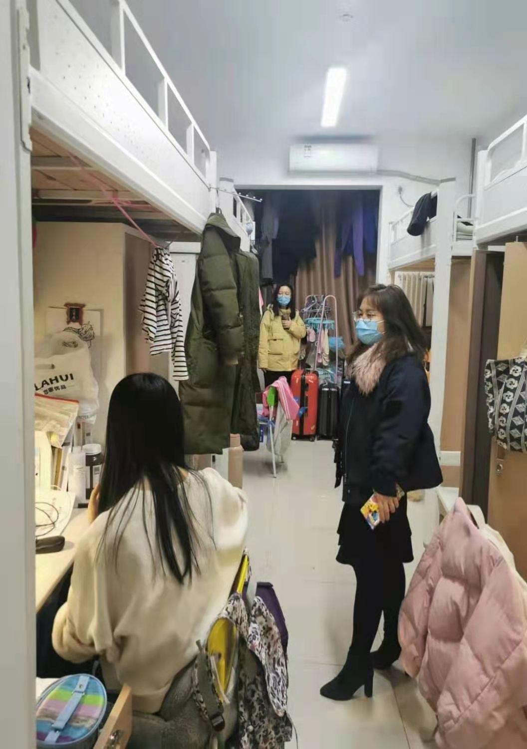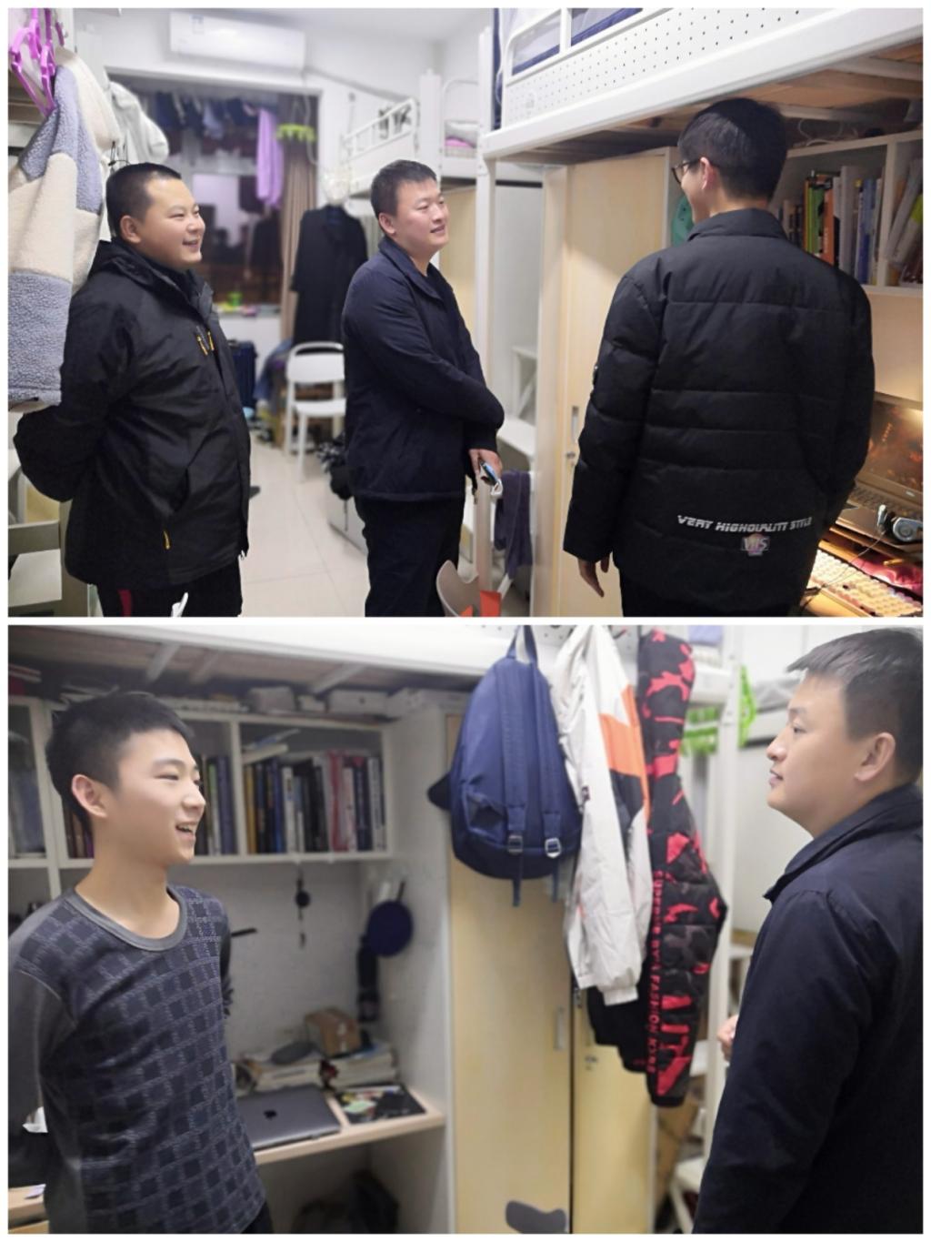 班会结束后,党委副书记高超带队,分团委书记朱鹏宇、专职辅导员白雪、各年级兼职辅导员分别前往分布在大运村、校内南区、校内北区的学生宿舍走访,了解学生返校状态、选课情况等,并再次强调做好疫情防控工作的要求,鼓励同学们有序开展校园生活,积极参与学习和科研。