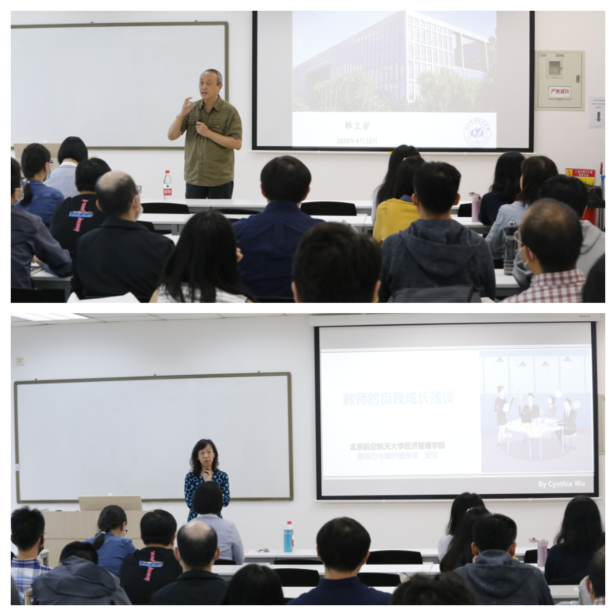 北京市教学名师韩立岩教授进行了主题为《教学底蕴与风格》的教学经验分享。韩教授回顾了个人从教三十多年来的经验与体悟,并从系统性思维、历史性思维、批判性思维和竞赛选题等多个方面进行了深入浅出的探讨。北航优秀主讲教师武欣副教授则以《教师的自我成长浅谈》为题,采用互动的方式进行了生动精彩的分享,从学生的角度出发与新进教师们探讨了如何做一名优秀的主讲教师。