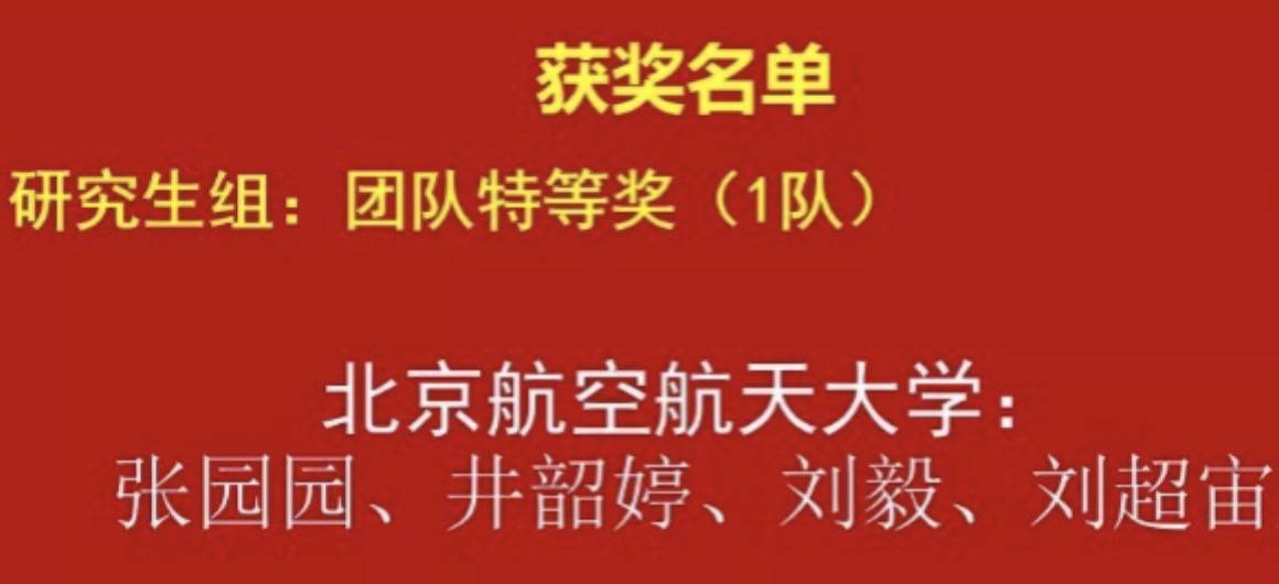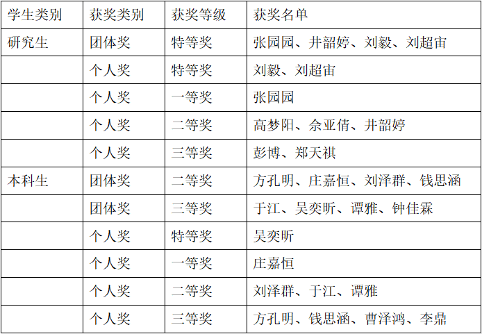 研究生组斩获了研究生组唯一的团队特等奖的最高荣誉,获得个人特等奖2项,个人一等奖1项,个人二等奖3项,个人三等奖2项。