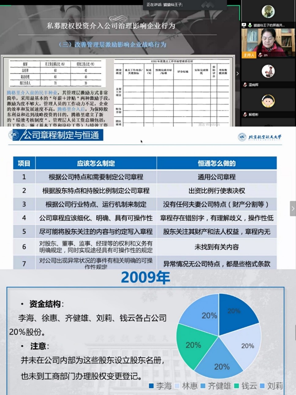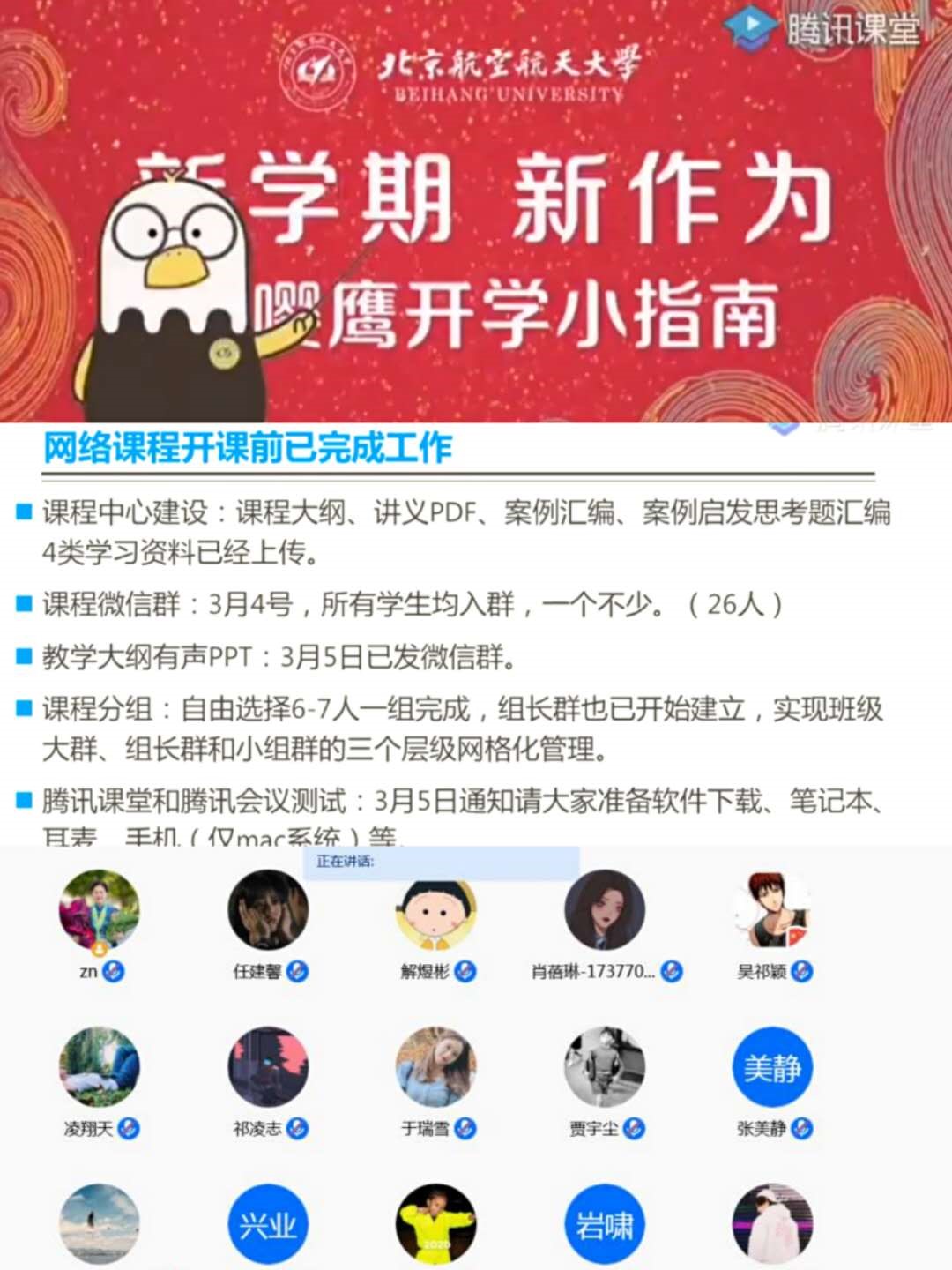 为共同应对新型冠状病毒肺炎疫情,365英国上市公司官网按照教育部“延期开学不停学、停课不停教”的总原则,采用教师在线授课等多种方式,最大程度地降低疫情对正常教学计划的冲击。北航365英国上市公司官网依照课程教学标准,统筹整合校内外课程资源和平台,深入挖掘各门课程线上教学资源,合理调整教学课程、教学时间及教学计划安排,采取混合式教学、直播、录播等形式,有序开展我校本科生网络教学工作。近日,在授课教师周宁老师、教务老师、助教以及学生们的共同努力下,本科生《公司治理》线上授课圆满结束。