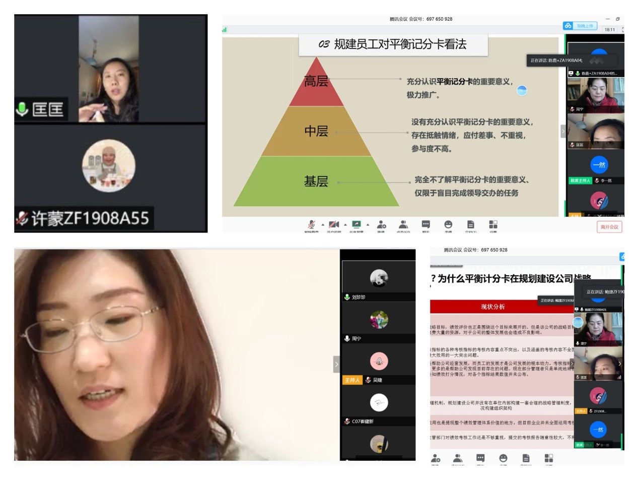 同时,在教学过程中,周老师两次邀请我校MBA校友进课堂,他们不仅是身经百战的企业管理者,还是荣获优秀案例的案例主人公——2013年全国第四届百优案例《平衡计分卡“太”平衡:规划建设公司战略绩效管理改革的“迷局”》的主人公匡婧和2017年全国MPAcc优秀案例《亡羊补牢,为时未晚:Z公司海外EPC项目成本管控艰辛之旅》的主人公刘珍珍。两位校友在腾讯会议中和同学们分享自己对案例的理解和体会,有多年实战经验的她们,对案例中所运用到的管理会计知识有更深刻的感悟和理解;她们还对各小组的汇报进行点评,指出亮点和不足。这种教学方式一方面加深了同学们对案例和理论知识的理解,另一方面也启发同学们思考如何更好地应理论知识指导实践的开展。