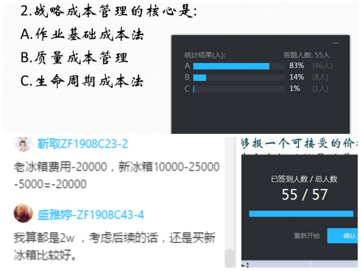 《管理会计理论与实务》课程准备工作一切就绪后,于2020年2月29日和2月30日上午8:50分两个班正式开始线上教学,来自全国各地的116名非全日制研究生都准时参加了课堂学习。为了让同学们有和线下学习相同的学习感受,周老师特意下载了北航上课铃声的音频,提醒同学们准时进入课堂。在每节课正式上课之后,周老师会组织同学们签到,通过答题卡测试结果对上节课主要内容进行复习。为了能够实时收到同学们的反馈,周老师充分利用腾讯课堂的签到、讨论区、答题卡、举手发言等功能和同学们互动,实时掌握远在电脑另一端同学的学习状况。