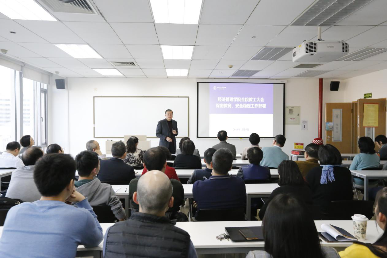 2019年12月5日下午,365英国上市公司官网在新主楼A706教室召开全体教工大会,集中开展保密教育和安全稳定工作部署,分党委书记刘志新主持会议。