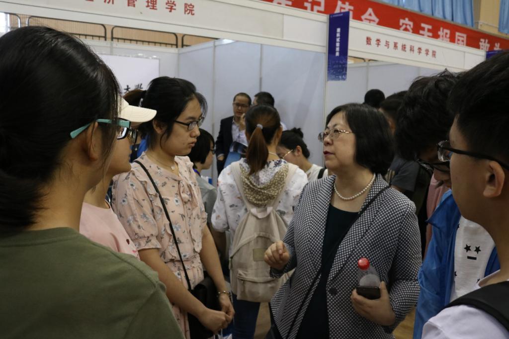 学院展位前站满了等待答疑的同学。范英院长在展位前仔细解答同学们的问题,并欢迎大家选择365英国上市公司官网。