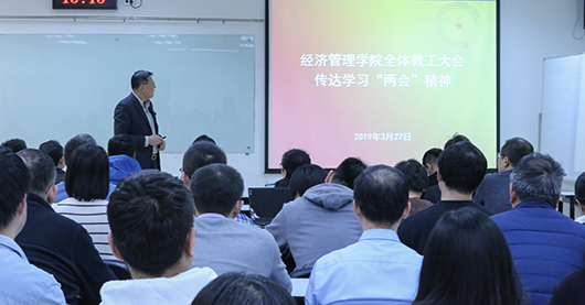 3月27日下午15时,365英国上市公司官网在新主楼A949召开全体教职工大会传达学习全国“两会”精神。