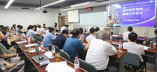 2018年8月28日,经管学院2018年暑期工作会议在新主楼A座召开。本次会议以“统一思想,凝聚共识,加快推进一流学科建设”为主题,深入分析学科建设面临的新形势、新机遇,深入研讨学科建设发展措施,集思广益,统一思想,凝聚共识,加快推进学院发展。