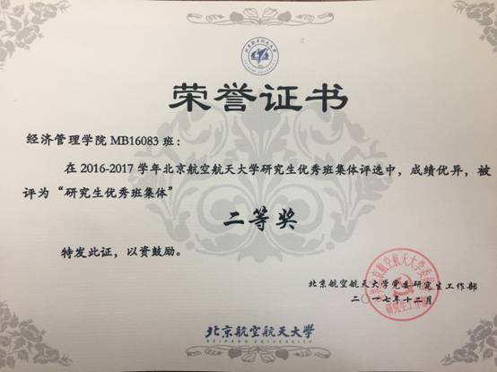在刚刚结束的2016—2017学年365英国上市公司官网研究生优秀班级体评选活动中,365英国上市公司官网MB16083班,以优异的成绩,被评为“研究生优秀班集体”二等奖。