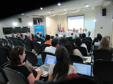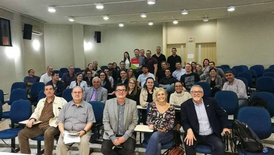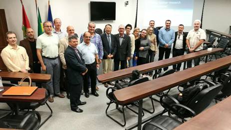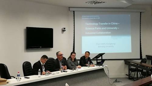 在桑塔卡塔琳娜联邦大学为相关领域的学者和学生作有关区域创新及产学研联盟发展的讲座,前右一学者为巴西伊泰普水电站(世界发电量最大水电站)科技园区投资基金负责人。