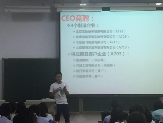第一天下午分组,共3个房间(A703、A713、A728),分布着4个制造企业、2个供应商、2个客户、外围服务中心等,并各自招聘员工,制作海报、开始组建自己的团队。