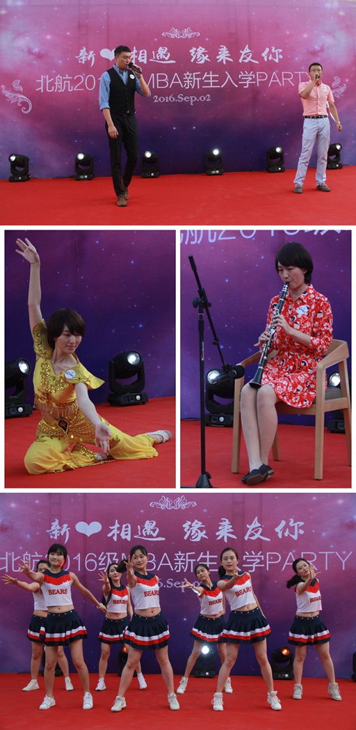 迎新盛典演出环节精彩纷呈,2016级新同学更是各展风采。16级3班实力唱将赖瑞杰、吕键鹏同学的男声合唱《YouRaiseMeUp》拉开了精彩序幕;2班邵校同学更是多才多艺,一支独舞《霓裳羽衣》悠扬古典、婀娜多姿,一首黑管独奏《MyHeartWillGoOn》也是技惊四座、余音袅袅;本场盛典最热烈的演出当属3、4班女生的集体舞《BigShow》,姑娘们炫目的舞姿伴着劲爆的音乐活力四射、嗨翻全场。演出期间还穿插了充满温馨、趣味的游戏“爱的抱抱”;全场师生还为九月过生日的同学集体送上祝福、合唱生日歌,活动现场温情洋溢。最后,MBA中心全体老师为2016级新生带来宁夏、阳光总在风雨后、同桌的你等歌曲联唱,表达对新同学们开启北航新生活的欢迎与祝福。迎新盛典在温馨浪漫、欢快惬意的气氛中落幕。
