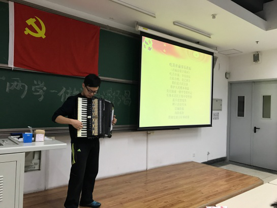 之后,我们根据前期搜集到的“两学一做”歌谣进行了现场教唱,选择了由脍炙人口的曲目《保卫黄河》改编的《吃苦在前享乐在后》,利用手风琴伴奏,大家其乐融融地进行了学习与传唱,每一位学生都精神饱满,热情高涨地学唱着。