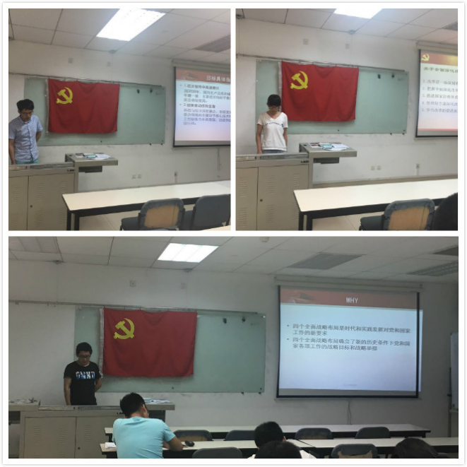 本期“两学一做”学习教育微党课学习在雄壮的《国际歌》声中开始。本次学习,由支部成员王景鹏、张兆泽、李飞飞讲党课。王景鹏同学做了题为“关于协调推进‘四个全面’战略布局”的微党课,张兆泽同学进行了题为“奋斗实现第一个百年奋斗目标”的微党课,李飞飞同学进行了题为“决定当代中国命运的关键一招——关于全面深化改革”的微党课。同学们一致体会到,党的十八大以来,以习近平同志为总书记的党中央高举改革开放旗帜,以更大的政治勇气和政治智慧推进改革,用全局观念和系统思维谋划改革,推进新一轮改革大潮涌进,博士生要不断加强学习科学文化知识和思想道德素质,同时要活学活用,做好理论与实践的高度统一。同学们还对百年目标和全面深化改革有了深入的认识和理解,体会到全面深化改革是“四个全面”战略布局中具有突破性和先导性的关键环节,党的十八届三中全会对全面深化改革进行了总体部署,各领域改革不断提速,改革举措出台的数量和力度均前所未有。之后,支部成员还开展了讨论。