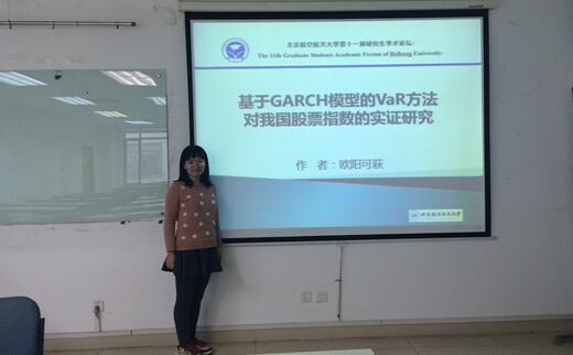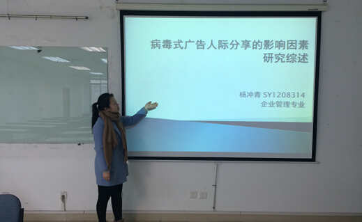 第一位宣讲人是欧阳可萩,题目是《基于GARCH类模型的VaR方法对股票指数的实证研究》,利用深交所的创业板指数和深证成分股指数数据讨论用GARCH类模型的方法计算风险价值(VaR),结果显示,深交所创业板指的波动频率比深成指大,但是在样本研究期限内创业板指的损失值比深成指小。另外,利用EGARCH模型得到的结果比GARCH模型好。第二位宣讲人是杨冲青,题目是《病毒式广告人际分享的影响因素研究综述》,对国内外病毒式营销和病毒式视频相关研究现状进行评述,将研究按照病毒式营销产生机制、营销模式以及营销评估三个方面进行归类。总体而言,病毒式营销的相关研究已经揭示了实际营销活动的大部分问题,但仍存在一些研究空白。论文作者的精彩讲解赢得了在场同学的热烈掌声。