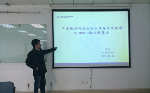 张秋同学的宣讲题目是“考虑横向转载多点库存系统模型与memetic 求解算法”,她主要讲道:“她针对供应链上同级零售商之间的横向调货问题提出一种混合紧急横向转载的库存系统模型,并对模型的损失销售情况进行了详细的介绍,然后整体介绍了文化基因算法(Memetic Algorithm)的基本原理及其基本运算流程,最后针对模型设计具体的文化基因算法,将文化基因算法用于混合横向转载模型中的损失销售情况。实验发现,应用横向转载策略可以有效降低供应链上库存的总成本。本文将文化基因算法成功应用于横向转载的库存模型中,对横向转载技术的发展和文化基因算法的应用领域的扩展有深远的意义。”