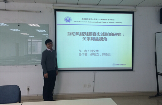 刘文华同学的宣讲题目是“互动风格对顾客忠诚影响研究:关系利益视角”,他主要介绍了在竞争性环境中,服务人员的有效互动尤其重要。基于此,应用关系营销理论,构建服务人员不同互动风格对顾客忠诚的影响模型,探索不同关系利益在其中的中介作用。以北京某品牌汽车4S店为背景展开实证研究。研究结果表明,服务人员互动导向型风格既对顾客忠诚产生直接的影响,还通过顾客感知的信任利益和社会利益对其产生间接影响,任务导向型和自我导向型互动风格仅通过顾客感知的信任利益对顾客忠诚产生间接影响。