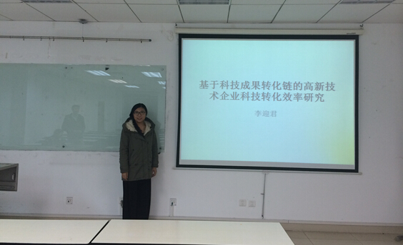 李迎君同学的宣讲题目是“基于随机前沿分析的高新技术企业科技成果”,她讲道:“她的文章是以创新扩散理论为视角,借助创新扩散的四个基本要素系统的分析科技成果转化过程及环境,找出科技成果转化影响因素并进一步构造影响因素指标体系,并且运用随机前沿模型对丰台科技园区高新技术企业科技成果转化效率及影响因素进行测度。研究表明,此科技园区的科技成果转化效率较高,企业拥有的科技成果数量及科研经费支持对科技成果转化具有显著的促进作用,此外政策环境及金融支持也会对科技成果转化起到促进作用。”