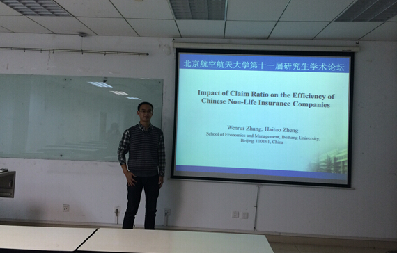 张文睿同学的宣讲题目是“Impact of claim ratio on the efficiency of Chinese non-life insurance companies”,他讲主要讲了赔付率对中国非人寿保险的影响。主要讲非径向的不定向方向距离函数用于解决赔付率问题。