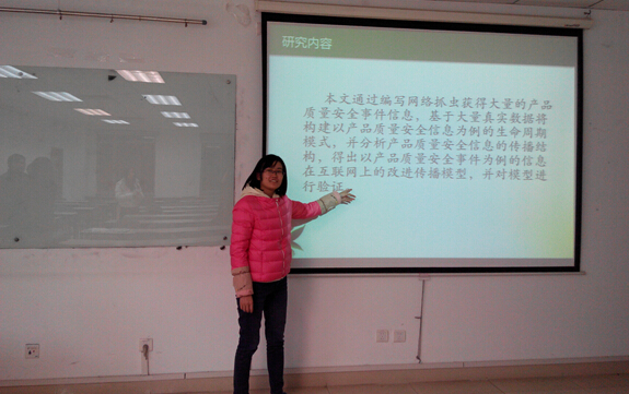 雷超同学的宣讲题目是“基于互联网的产品质量安全信息传播模型研究”,他主要介绍了为了减少产品质量安全信息在互联网上传播所带来的损失,基于复杂网络和信息传播理论,采用仿真实验的方法对产品质量安全信息在Internet上的传播模型进行了研究,得到与产品质量安全信息传播的相关结论。在产品质量安全信息的传染病传播模型中,随着自发传播系数的增大,信息的扩散速率会加快,系统达到平衡的时间也会缩短;同时,随着系统规模的增大,信息所达到的面积也会随着增大,而且信息扩散达到最大面积的时间不会随着系统规模的变化而变化,媒体的介入会对信息的传播造成一定的影响。
