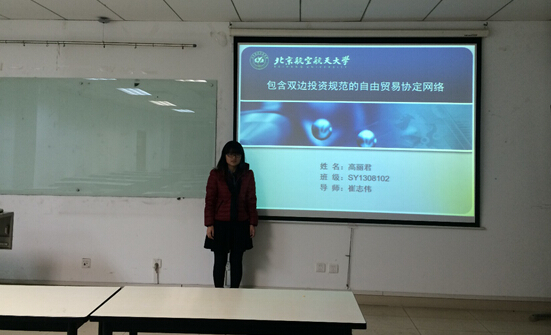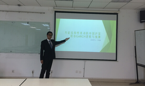 第一位宣讲人是胡婷婷,题目是《基于EVA的HZK公司全面预算管理研究》,阐述全面预算管理和EVA 的相关理论方法,以HZK 公司为例,分析该公司在全面预算管理实施过程中存在的问题及原因,讨论全面预算管理与EVA 的契合模式,以提升EVA 为目标,实际构建HZK 公司全面预算管理的新模式,借此寻求全面预算管理的新思路、新方向,推动企业的科学管理进程。第二位宣讲人是高丽君,题目是《包含双边投资规范的自由贸易协定网络》,通过假定双边自由贸易协定包含着无限制对外直接投资规范,基于Goyal和Joshi (2006),构建了相应FTA网络形成博弈模型。第三位是王赓,题目《考虑结构性波动的中国沪深股市GARCH建模与预测》,以上证综指和深证成指样本期内(1996年12月16日到2012年12月31日)和样本期外(2013年1月4日到2013年6月28日)的日对数收益率序列为研究对象,运用划分均值和方差变点的迭代累计平方和算法(ICSS:MV)检测样本期内的结构变点。在此基础上,将结构变点作为虚拟变量引入参数GARCH族模型,利用逐步筛选法的后向法加以调整。最后运用六项误差度量指标对GARCH族模型和引入虚拟变量的GARCH族模型在样本期内的拟合效果和样本期外的预测能力进行评价。论文作者的精彩讲解赢得了在场同学的热烈掌声。