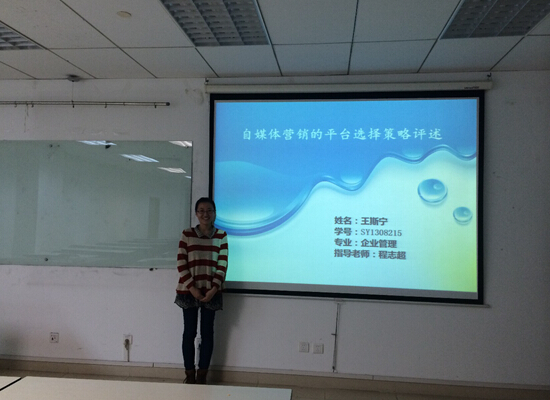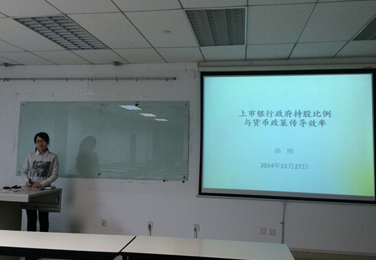 第一位宣讲人是孙欧,题目是《上市银行政府持股比例与货币政策传导效率》,应用2007-2012 年中国上市银行季度数据,创新性的构建货币政策效率指标,并分别通过分组定性分析和数值定量分析建立面板数据模型,研究银行政府持股对货币政策传导效率的影响。第二位宣讲人是王斯宁,题目是《自媒体营销的平台选择策略评述》,首先对自媒体的基本内容进行回顾与总结。其次总结了企业在自媒体平台上的营销发展现状,进而总结了自媒体营销面临的问题。最后为企业自媒体营销的平台选择提出了相应的策略。第三位是陈彬彬,题目《套期保值者策略性交易和市场多重均衡》,从金融市场微观结构理论出发,通过分析知情交易者交易策略和做市商定价策略对套期保值者交易的影响,构建了套期保值者策略交易模型。论文作者的精彩讲解赢得了在场同学的热烈掌声。